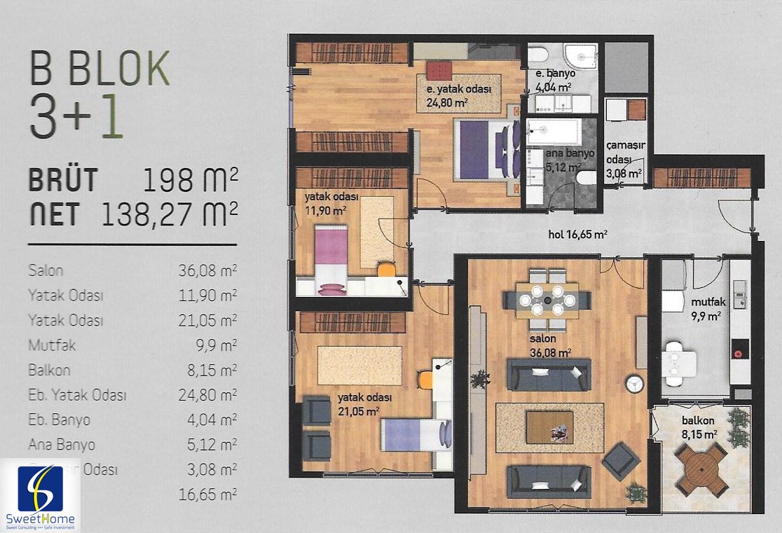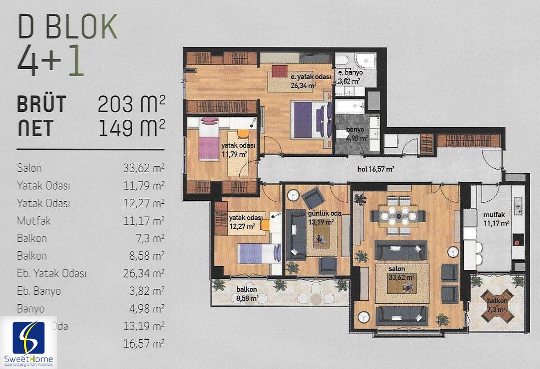 | 3 + 1 | 172 m2 | 203 m2 | 693090 | 852720 | TRY |